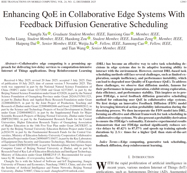 近日,三级片在线 徐常福博士以第一作者在边缘计算领域国际顶级期刊IEEE Transactions on Mobile Computing上发表论文,论文题目为“Enhancing QoE in Collaborative Edge Systems with Feedback Diffusion Generative Scheduling”。论文链接://ieeexplore.ieee.org/document/11077726